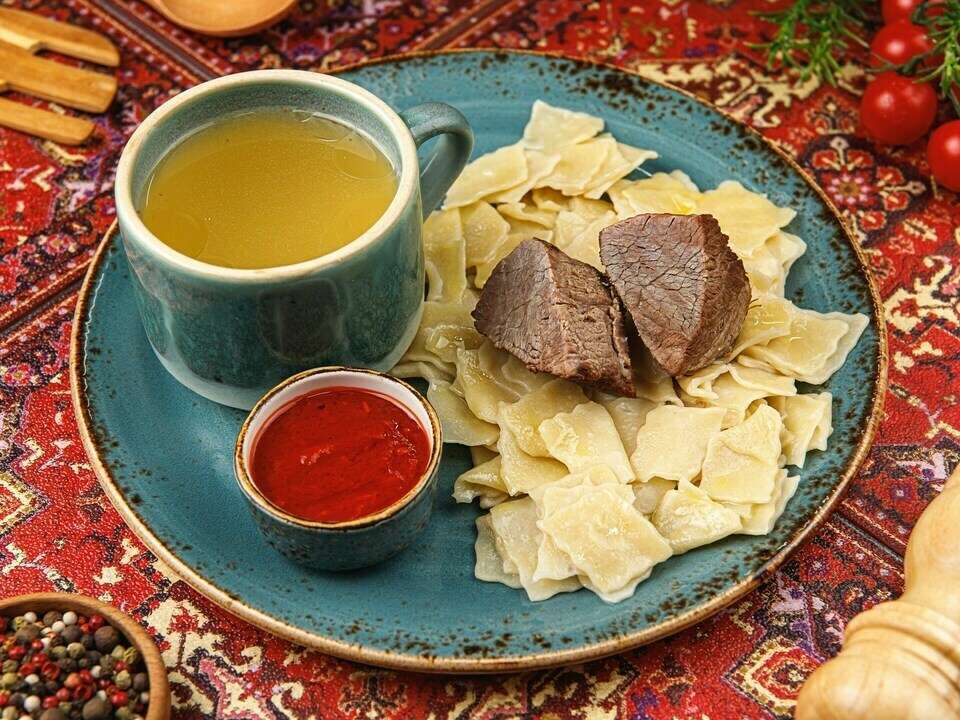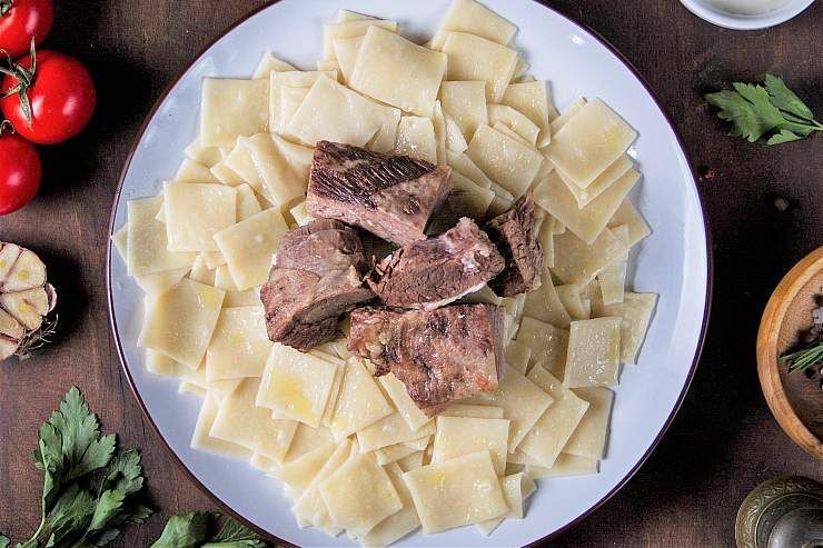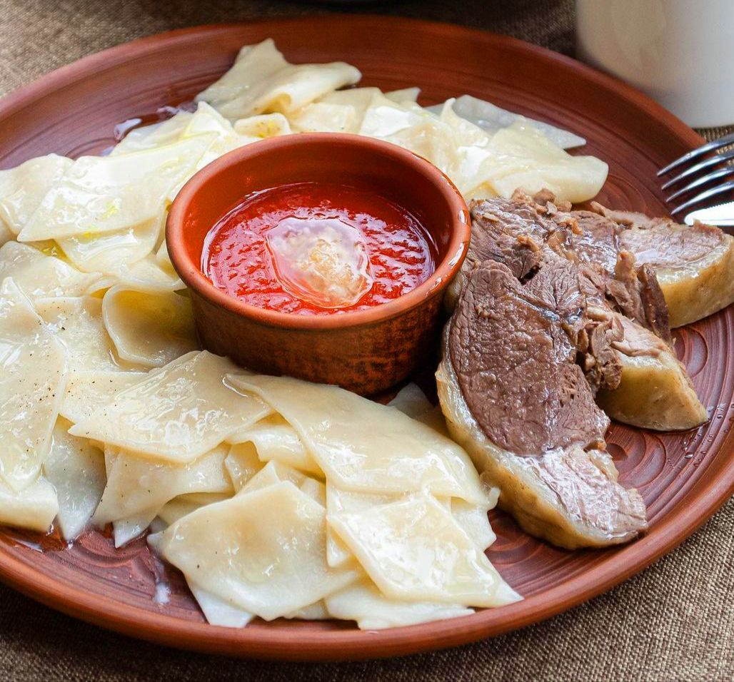 традиционное блюдо дагестанской кухни - кусочки теста, сваренные в мясном бульоне, подается с бараниной или говядиной (иногда с курицей) с пиалой мясного бульона и соусом.